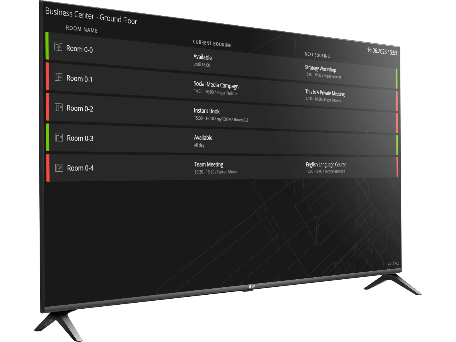 • Flightboard displays viser optagede og ledige rum. Denne applikation er gratis og kan bruges på en hvilken som helst smart skærm. Den giver et let overblik i fx. en reception, over hvilke mødelokaler der er ledige og eller hvilket møde lokale der er reserveret til dit møde.